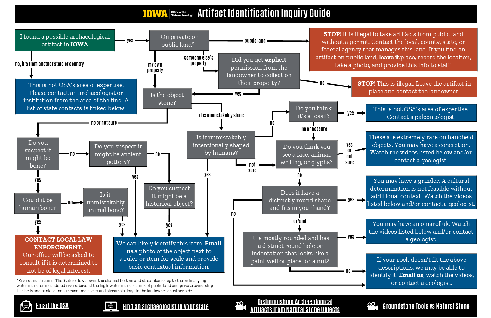 We offer assistance with identifying human artifacts and cultural artifacts from Iowa. Fees may be required to assess or identify larger collections. Use the decision tree below to help determine that OSA has the expertise to identify your object. If you email us, please include a scale in your photo. Also note, we are not specialists in the identification of fossils or geological specimens.